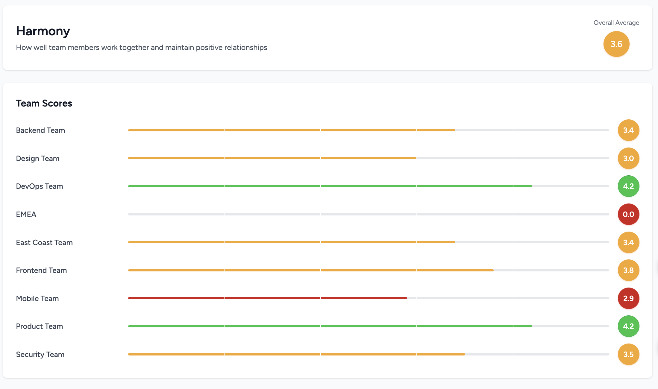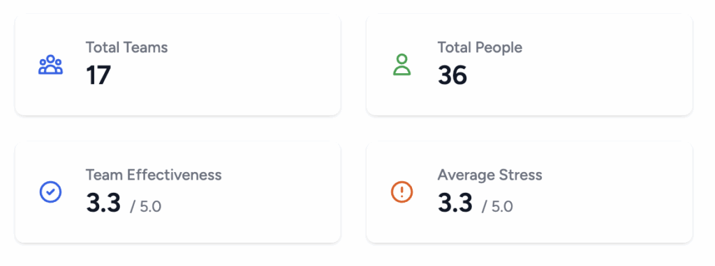 Track the number of teams, total people, average team effectiveness and overall stress levels at a glance.