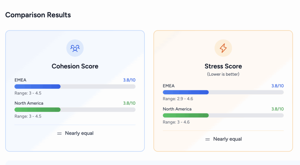 Easily compare performance across areas, divisions or territories. Track cohesion, stress and performance trends by region.