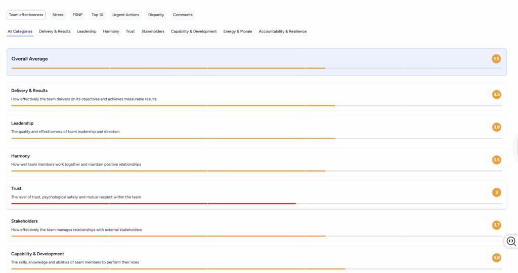 Each report visualises key areas such as cohesion, trust, leadership, morale and resilience, helping organisations understand the story behind the numbers.
